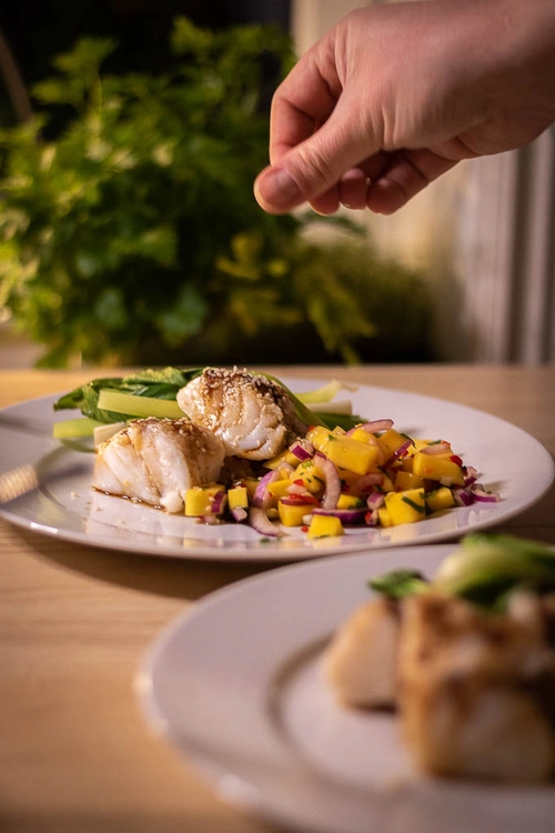 - Ha over koriander og drypp over restene av soyasausen ved servering. Server med mangosalsa og eventuelt ris.