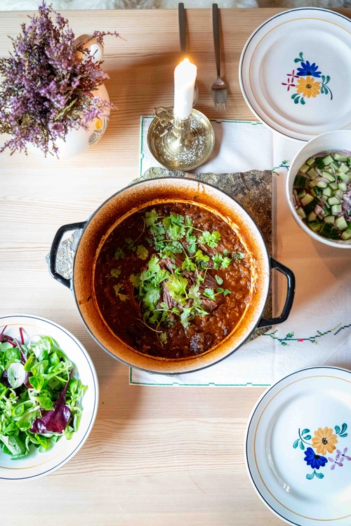 - Rør inn hakket koriander i gryta og server med ris og agurksalat.